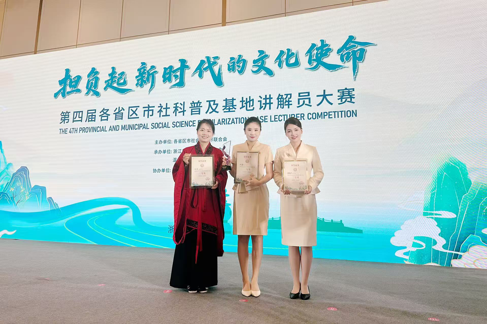 9月22日至24日,由全国各省区市社科联联合主办、浙江省社科联承办的第四届各省区市社科普及基地讲解员大赛在浙江温州举行。本届大赛以“担负起新时代的文化使命”为主题,来自全国31个省区市的93名社科普及基地讲解员同台竞技,经过自主命题讲解、随机命题讲解和评委问答等环节的激烈比拼,大赛最终评选出一等奖10名、二等奖16名、三等奖20名。